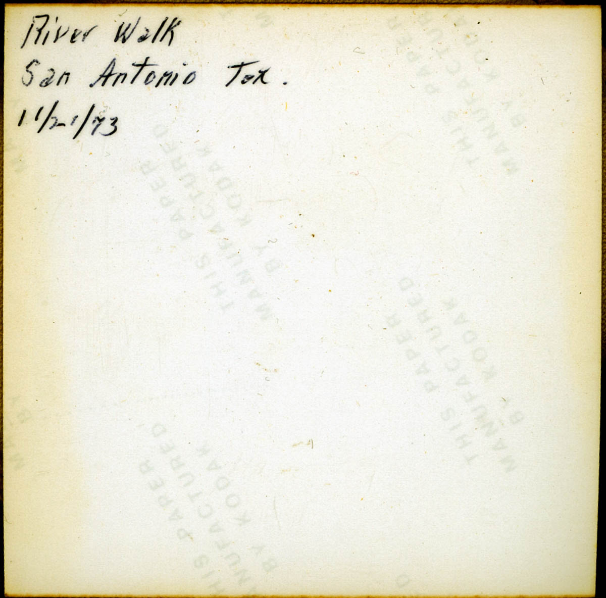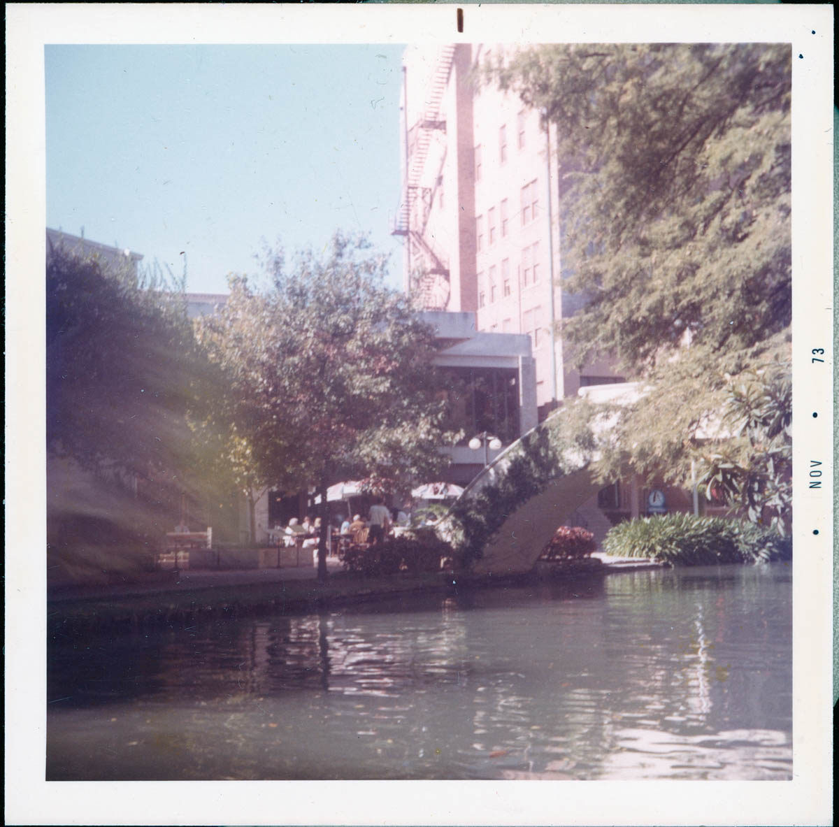 - Snapshot of a river with sidewalks, cafes and footbridges. Handwritten label on back says "River Walk, San Antonio, Tex. 11/21/73."