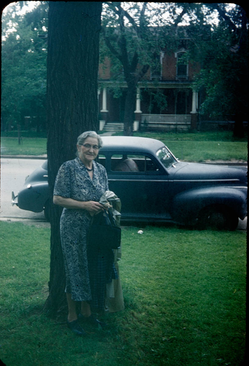- Snapshot of a woman standing by a tree. Handwritten note says "Julia Cotton - Topeka Ks June 1954."