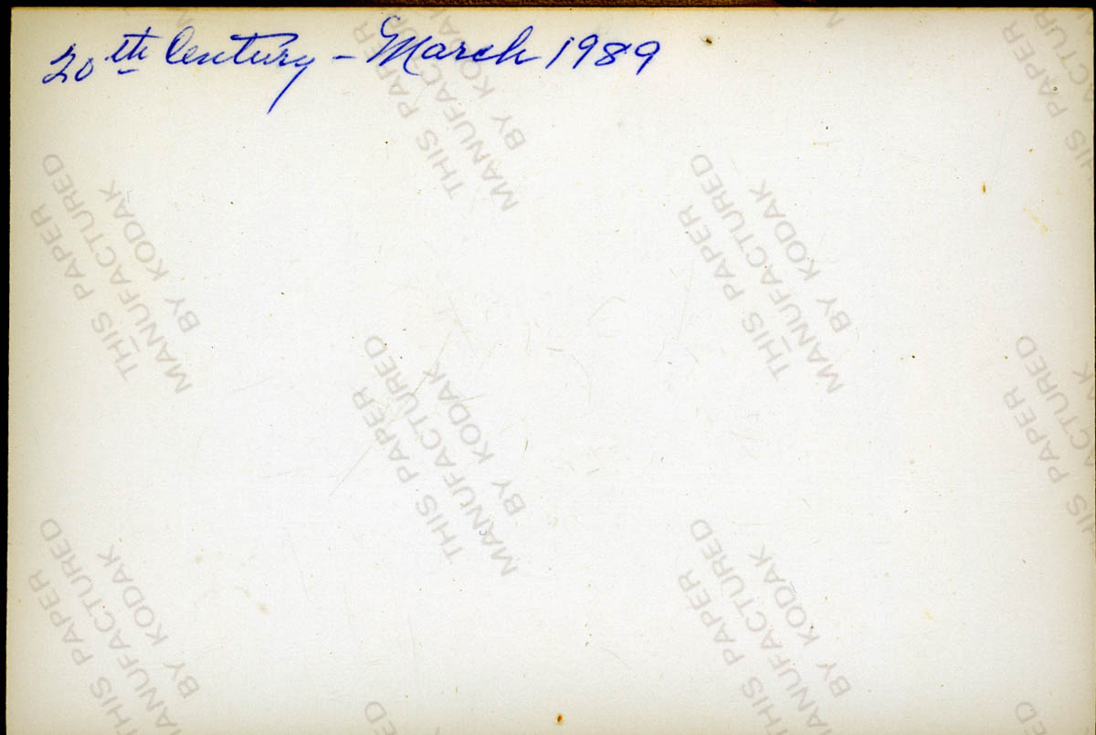 - Snapshot of women in choir gowns on a stage behind a young woman holding a box. Handwritten note on back says "20th Century - March 1989"