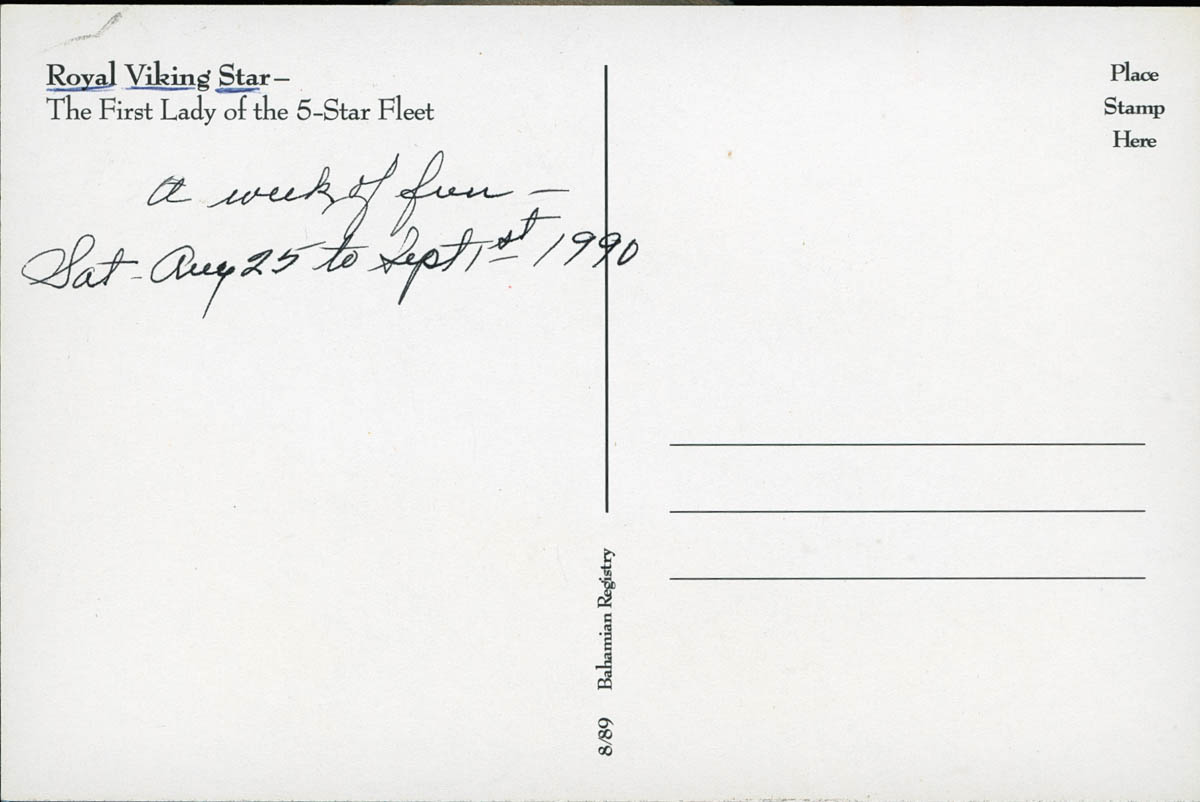 - Photo postcard of a cruise ship. Handwritten label on back says "A week of fun. Sat-Aug 25 to Sept 1st 1990."