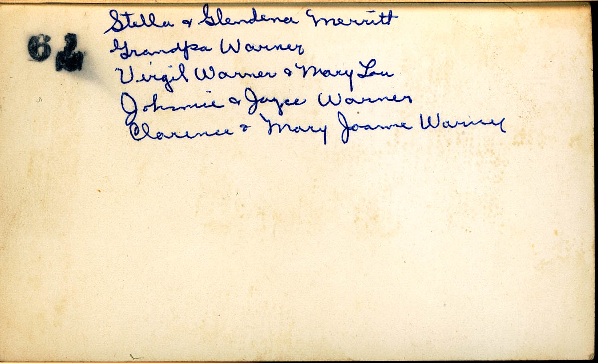 Handwritten label on back says "Stella & Glendena Merritt, Grandpa Warner, Virgil & Mary Lou Warner, Clarence & Mary Joanne Warner, Johnnie & Joyce Warner" - Creator