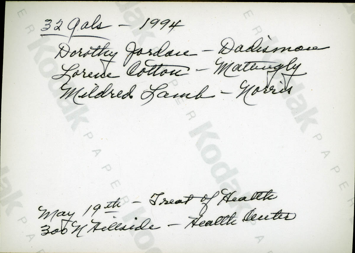 - Snapshot of women sitting at a lunch table. Handwritten label on back says "32 Gals - 1994. Dorothy Jordace-Dadismore, Lorene Mattingly-Cotton, Mildred Lamb-Norris. May 19th - Treat[sic] of Health, 300 N Hillside - Health Center"