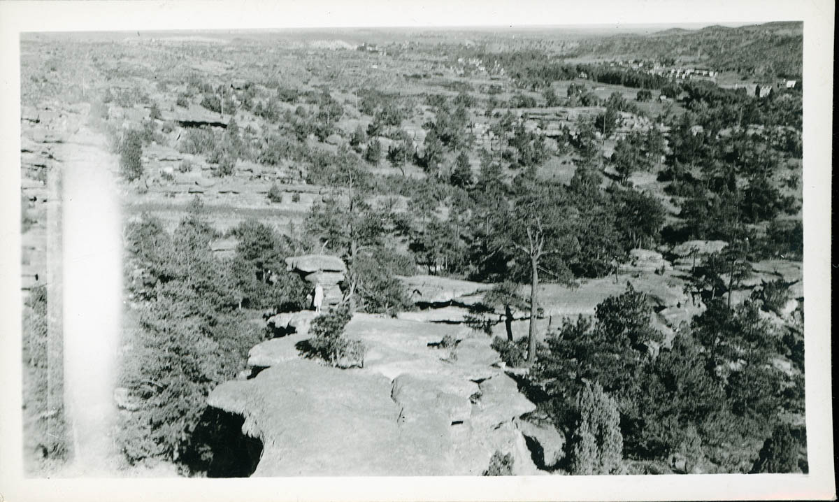 - Snapshot of a woman posing by a rock formation in the mountains. Handwritten label on envelope says "Colo. 1941. Our first vacation"