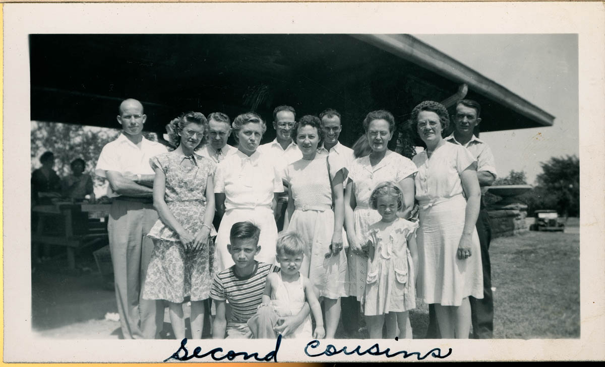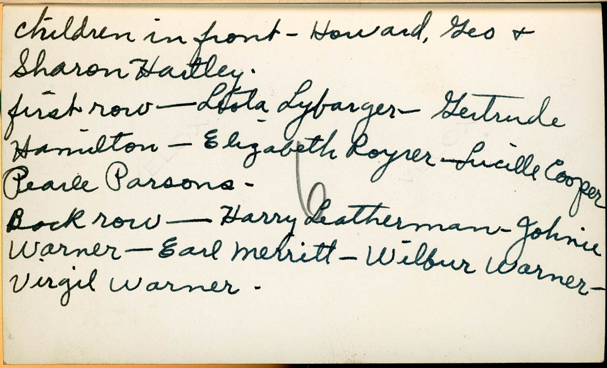 Handwritten label on front says "Second Cousins" Handwritten label on back says "Children in front - Howard, Geo & Sharon Hartley. First row - Leola Lybarger - Gertrude Hamilton - Elizabeth Royrer - Lucille Cooper - Pearl Parsons. Back row - Harry Leatherman - Johnie Warner - Earl Merritt - Wilbur Warner - Virgil Warner." - Date