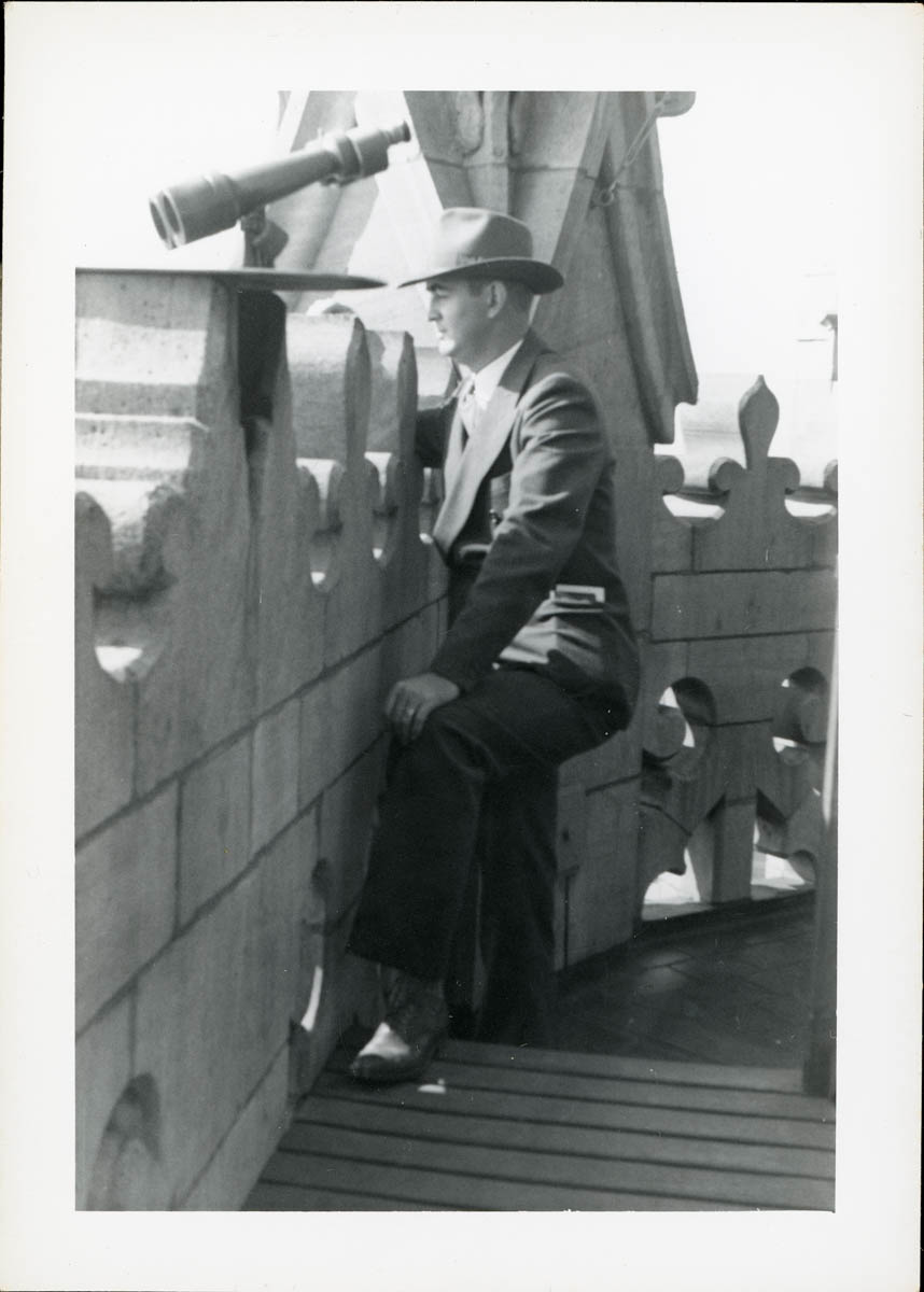 - Snapshot of a man looking out from a skyscraper observation deck. Handwritten label on envelope says "Chicago Trip 1942 I went on to Ky to Aunt Lizzie"
