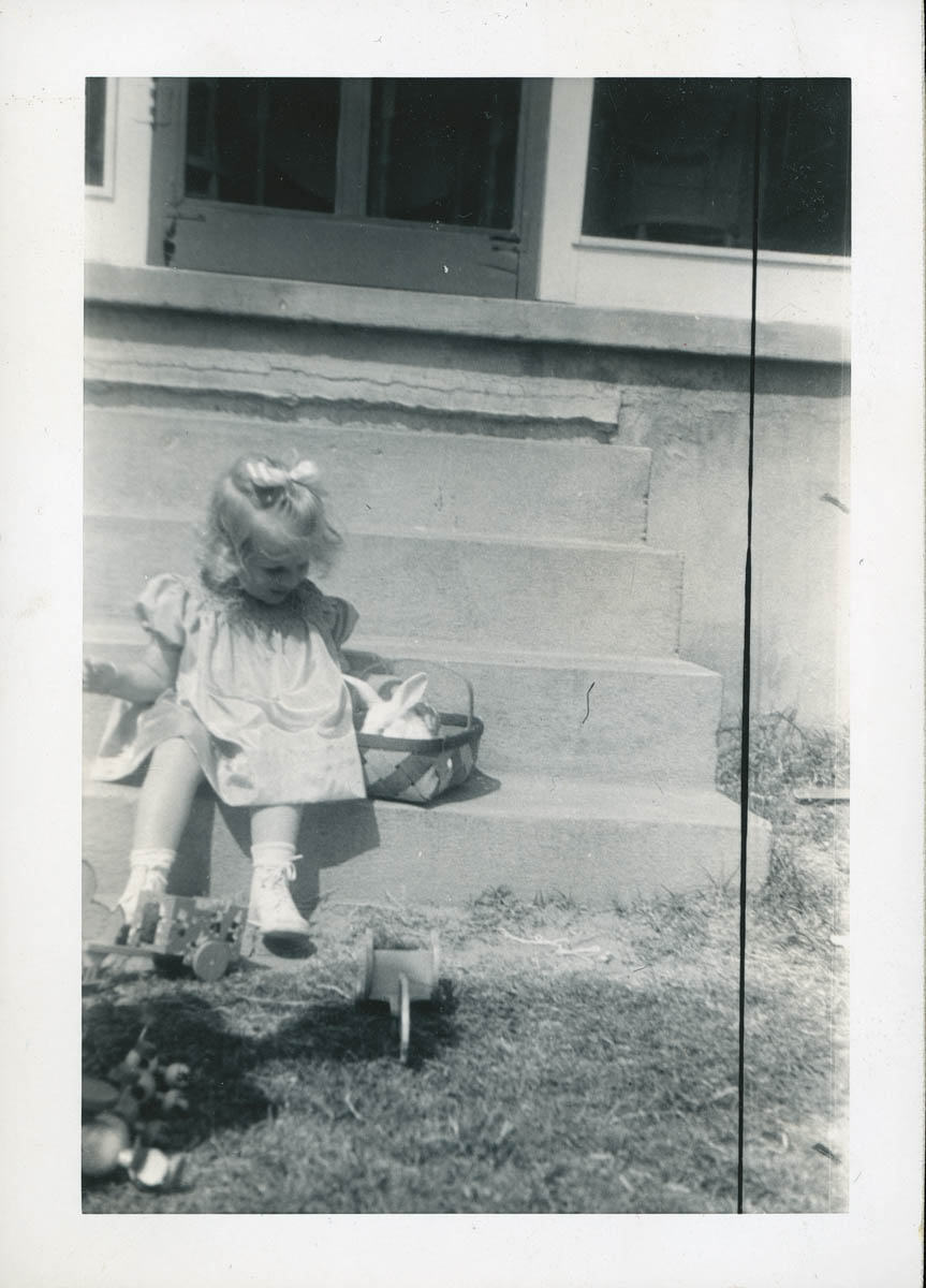 - Snapshot of a little girl sitting on steps with a rabbit in a basket.