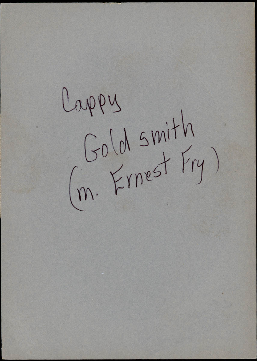- Portrait of a woman. Handwritten label says "Cappie Goldsmith." Handwritten label on back says "Cappy Goldsmith (m. Ernest Fry.)" This is an item in a photo album.