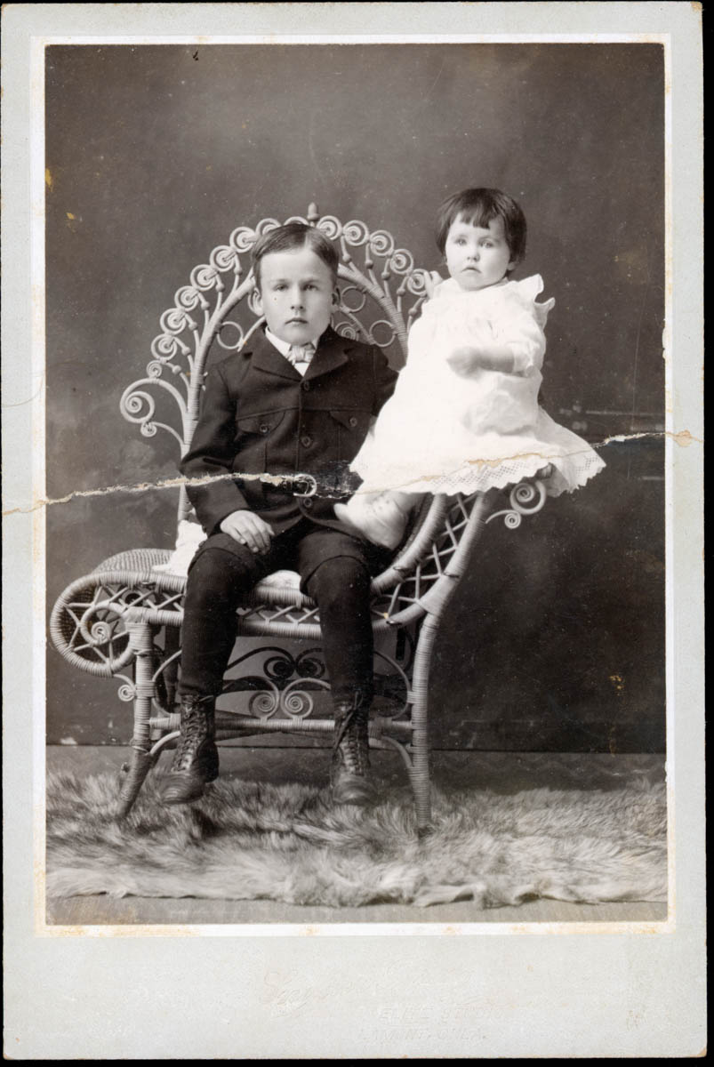 - Portrait of a baby and a young boy in a chair. Handwritten label on page says "Carl & Fern Goldsmith" This is an item in a photo album.