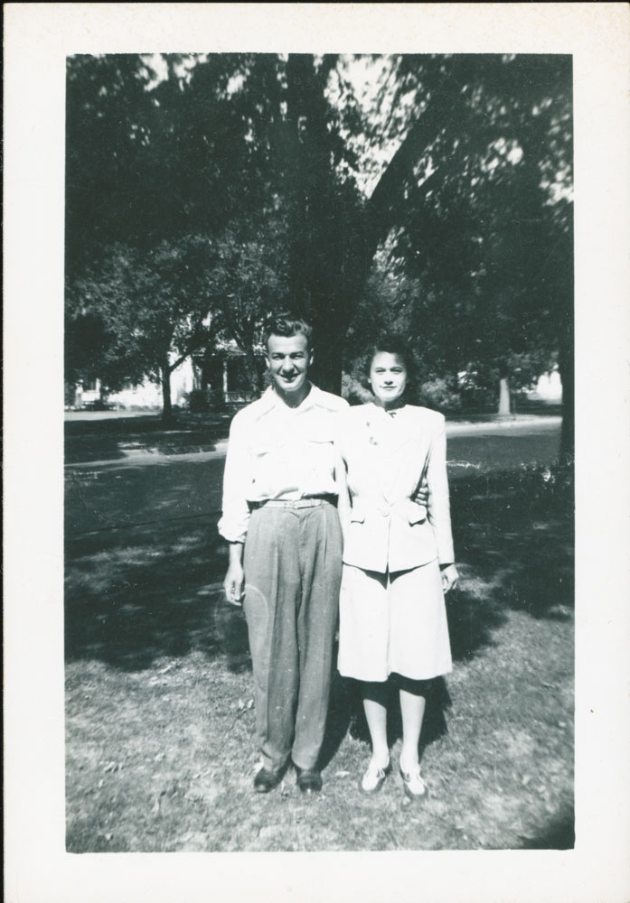 - Snapshot of a man and woman standing under a tree. Handwritten label on back says "Mr and Mrs James A Crigger Sept 25/47"