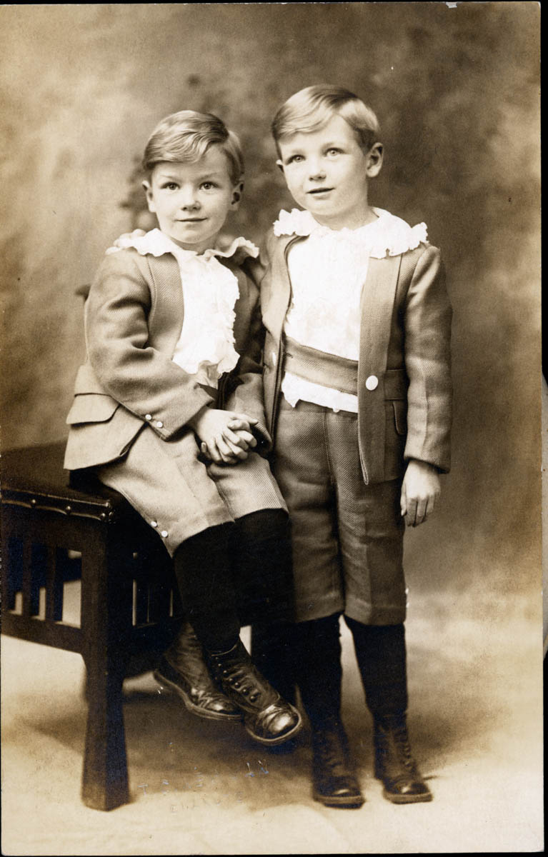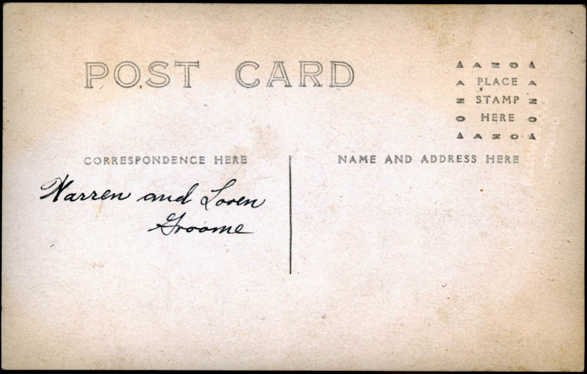 - Postcard portrait of two young boys. Handwritten label on back says "Warren and Loren Groome"