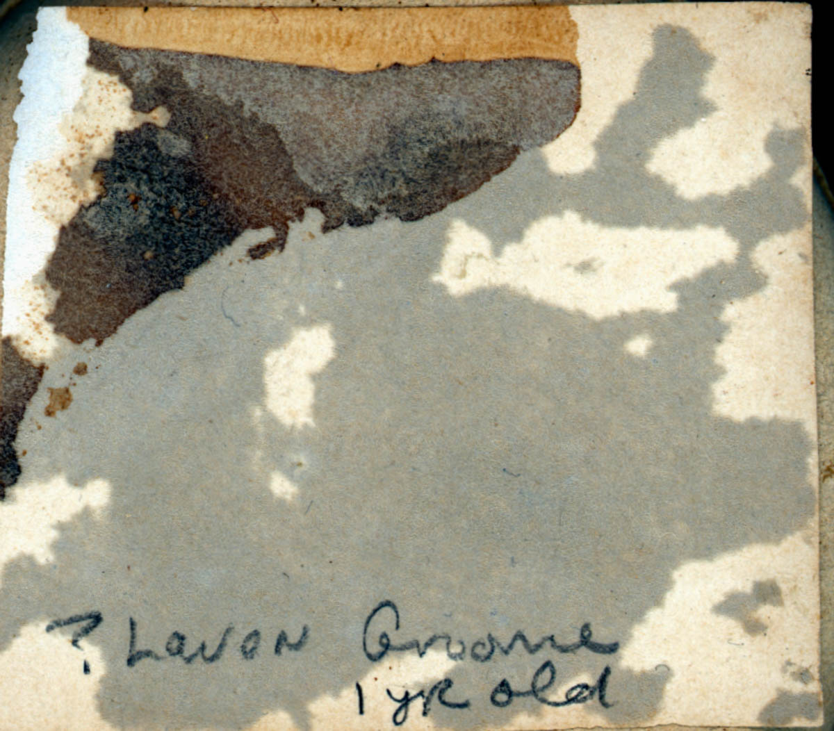 - Photograph of a baby in an ornate wicker carriage. Handwritten label on back says "? Lavon Groome 1 yr old."