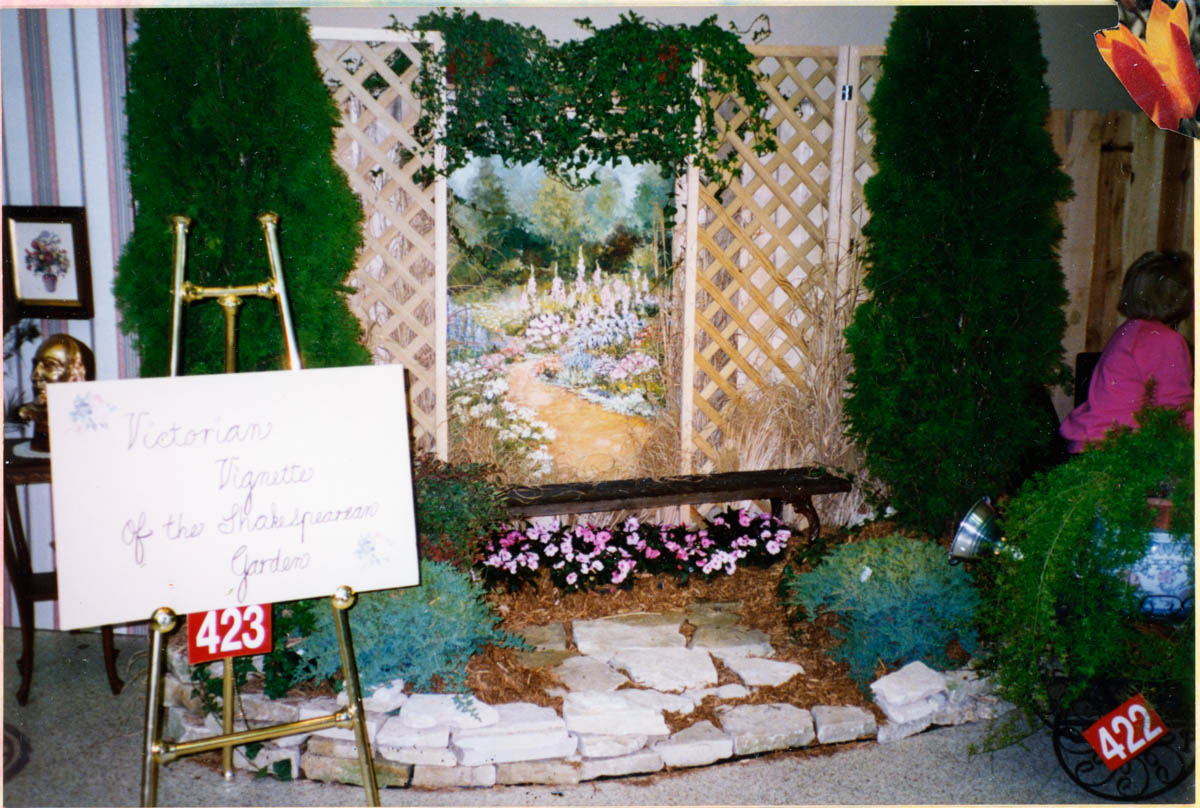 - Snapshot of a garden show booth. Typed caption says "Prize Winner Victorian Vignette of Shakespearean Garden. Painting by Patricia Maechtlen." This photo is part of album MHGS_PB_1995-96.