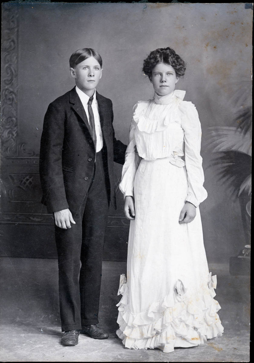 - Portrait of a young man and woman. Handwritten label on back says "Pearl and Lena Pearson. Taken Johnson Studio Cherryvale, KS."