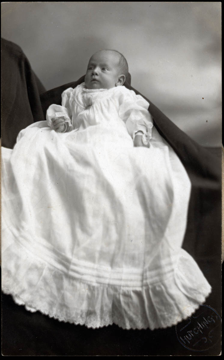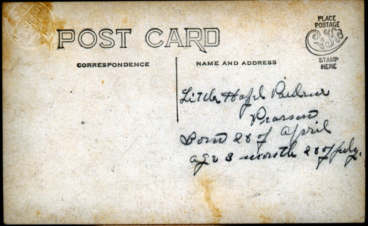 - Real photo postcard with picture of a baby. Handwritten label on back says "Little Hazel [illegible] Pearson, Born 28 of April, age 3 month 28 of July."