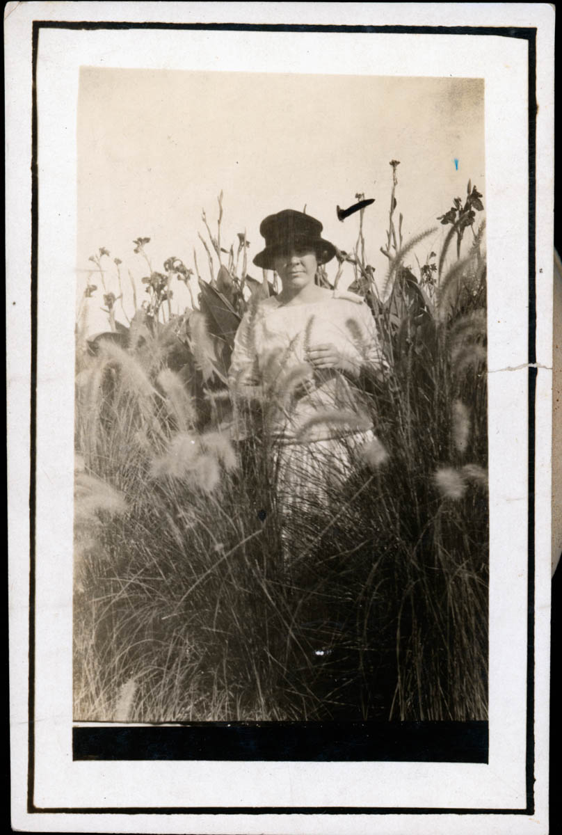 - Snapshot of a woman standing in a park. Handwritten label on back says "Miss Addie Pearson, BartlesVille Okla Taken in the Little Park."