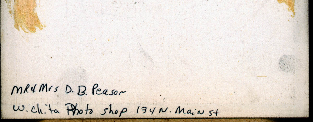 - Portrait of a man and woman. Handwritten label on back says "Mr & Mrs D B Pearson. Wichita Photo Shop, 134 N Main St."