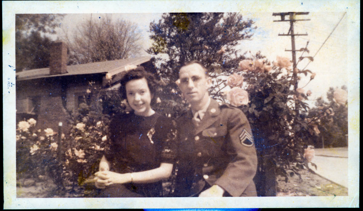 - Photograph of a woman and a man in military uniform sitting in a garden. Handwritten caption says "The object of our affection. April, 1944. Visalia, Calif." This is an item in scrapbook MHGS_Stump_Album_D.