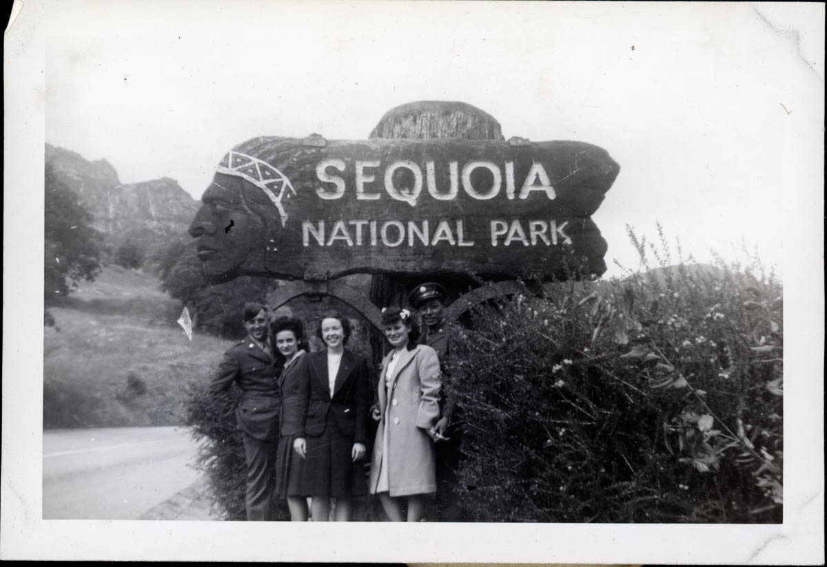 - Photograph of three women and two men standing in front of a sign for a national park. Handwritten caption says "Easter Sunday 1944." This is an item in scrapbook MHGS_Stump_Album_D.