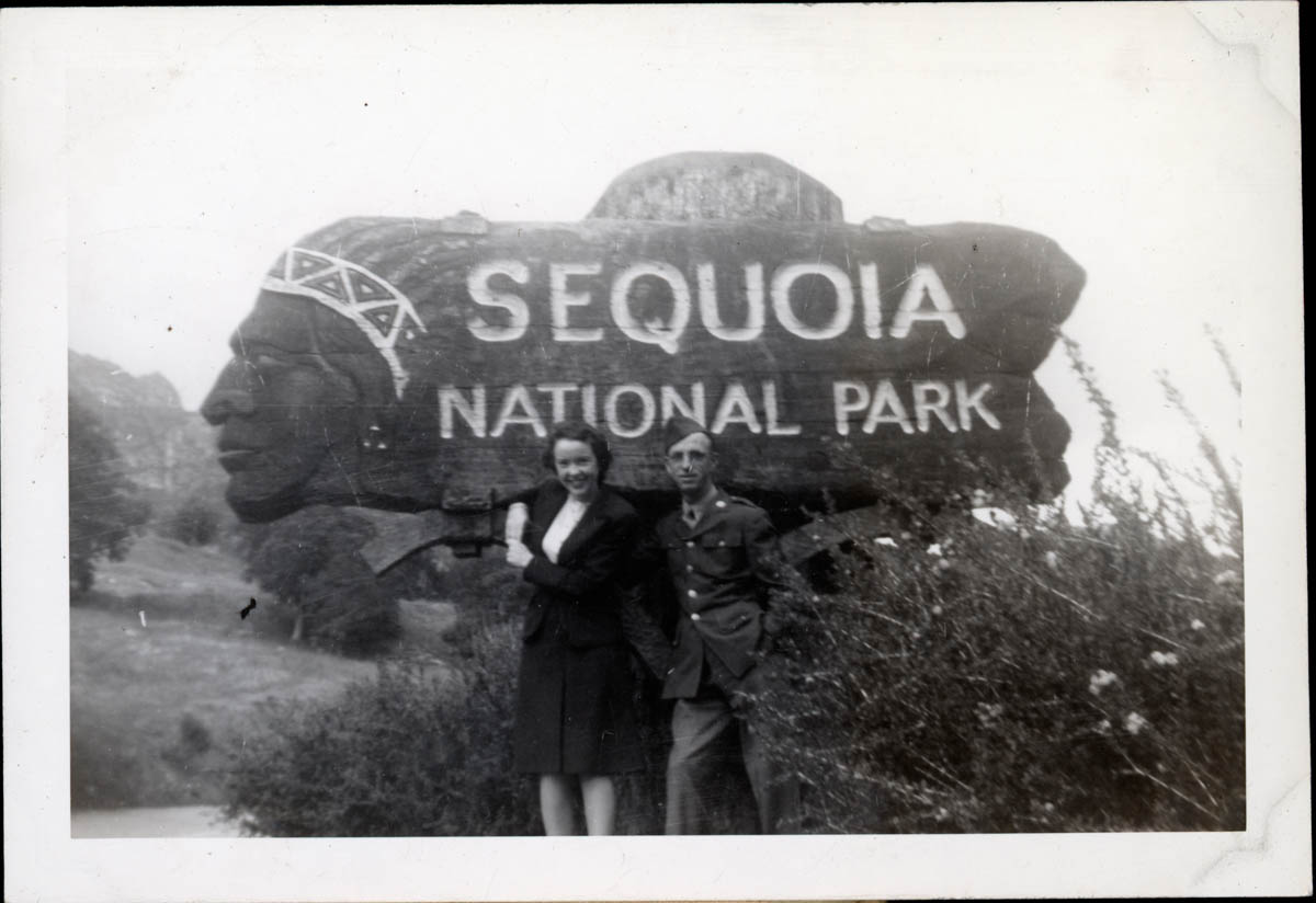 - Photograph of a woman and a man standing in front of a sign for a national park. Handwritten caption says "Easter Sunday 1944." This is an item in scrapbook MHGS_Stump_Album_D.