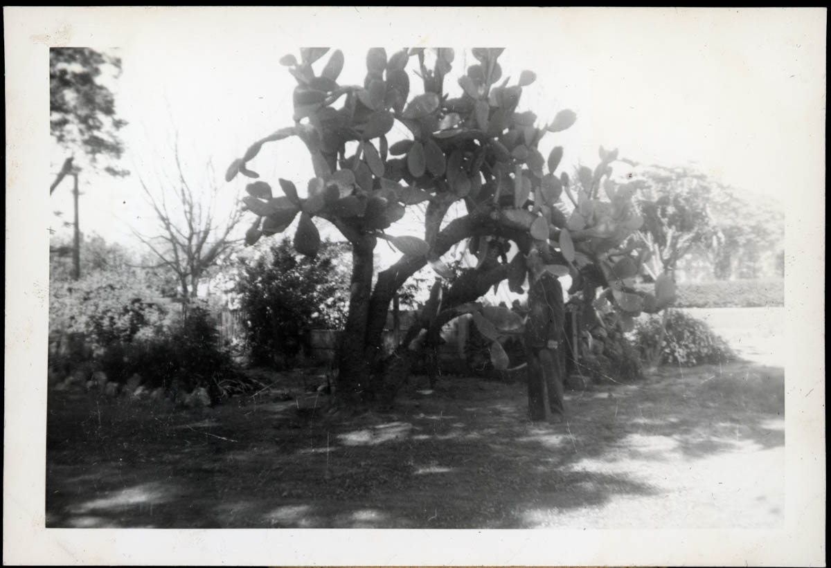 - Photograph of a man in uniform looking at a prickly pear cactus. Handwritten caption says "Visalia, Calif." This is an item in scrapbook MHGS_Stump_Album_D.