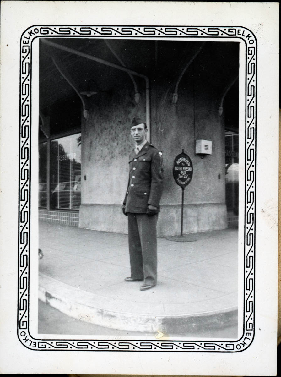 - Photograph of a man in uniform standing on a corner. Handwritten caption says "Fresno, Calif. Feb. 1944." This is an item in scrapbook MHGS_Stump_Album_D.