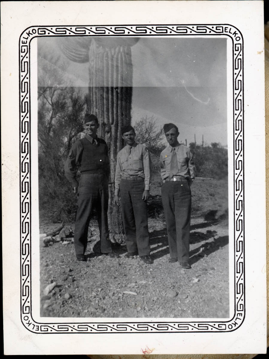 - Photograph of three men in military uniforms standing in front of a cactus. Handwritten caption says "P. Green, Bruce, Lem. Desert Jan 1944." This is an item in scrapbook MHGS_Stump_Album_D.
