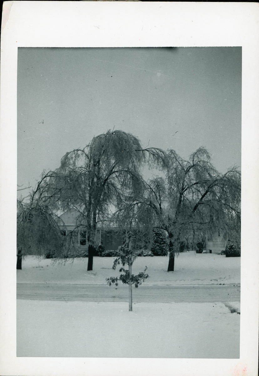 - Snapshot of ice on trees. Handwritten label on back says "Ice Storm."