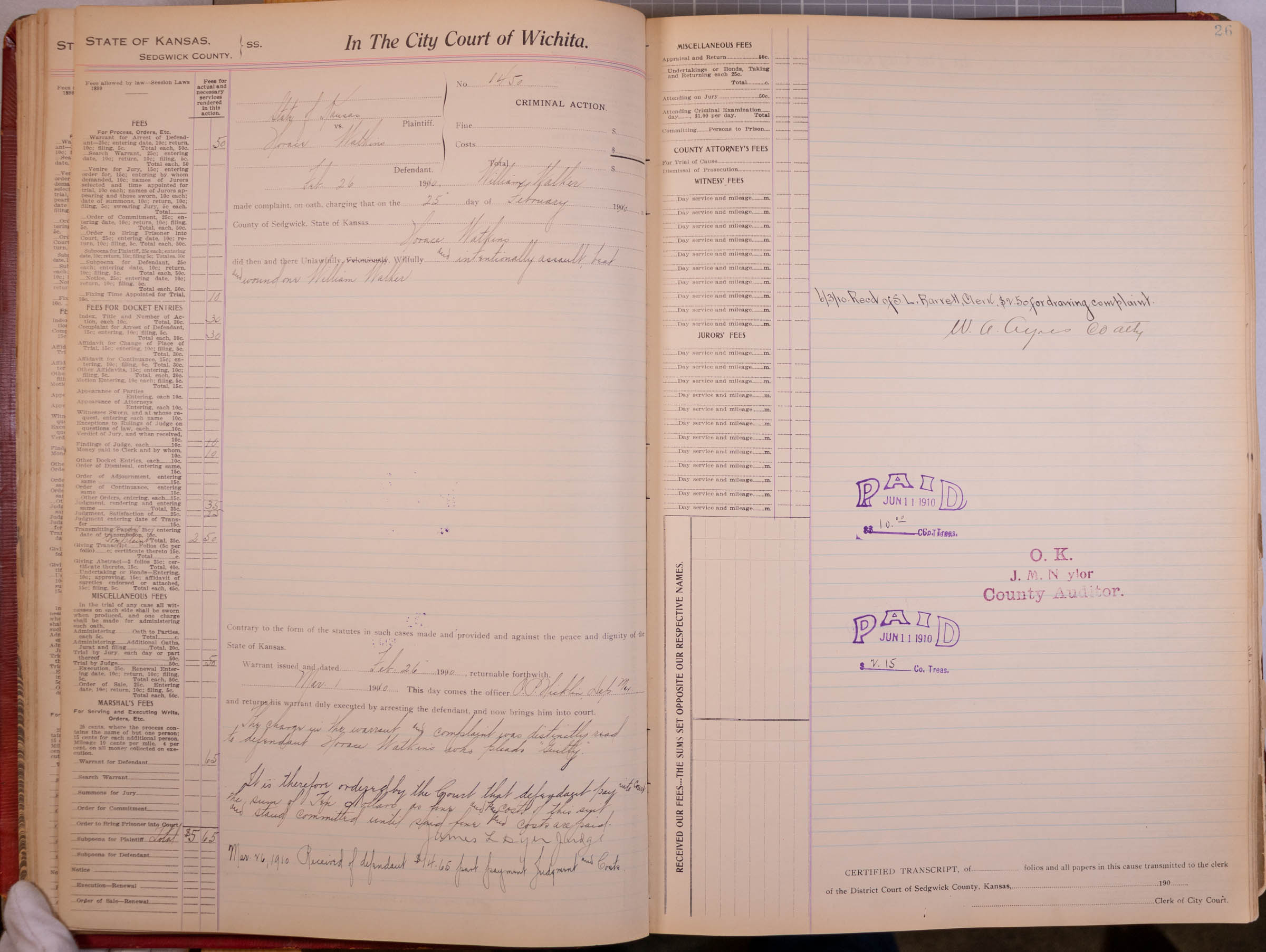 City Court of Wichita, “City Court of Wichita Case #1450: Horace Watkins,” MHGS Digital Collections, accessed April 17, 2026, https://mhgswichita.org/om/items/show/2554.