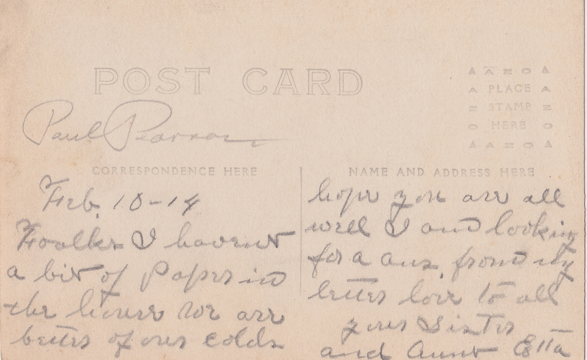 Handwritten on back "Paul Pearson" and "Feb 10 - 14 Foalks [sic] I haven't a bit of paper in the [illegible] we are better of our colds Hope you are all well I am looking for a ans from my letter love to all your sister and Aunt Ella" - Date
