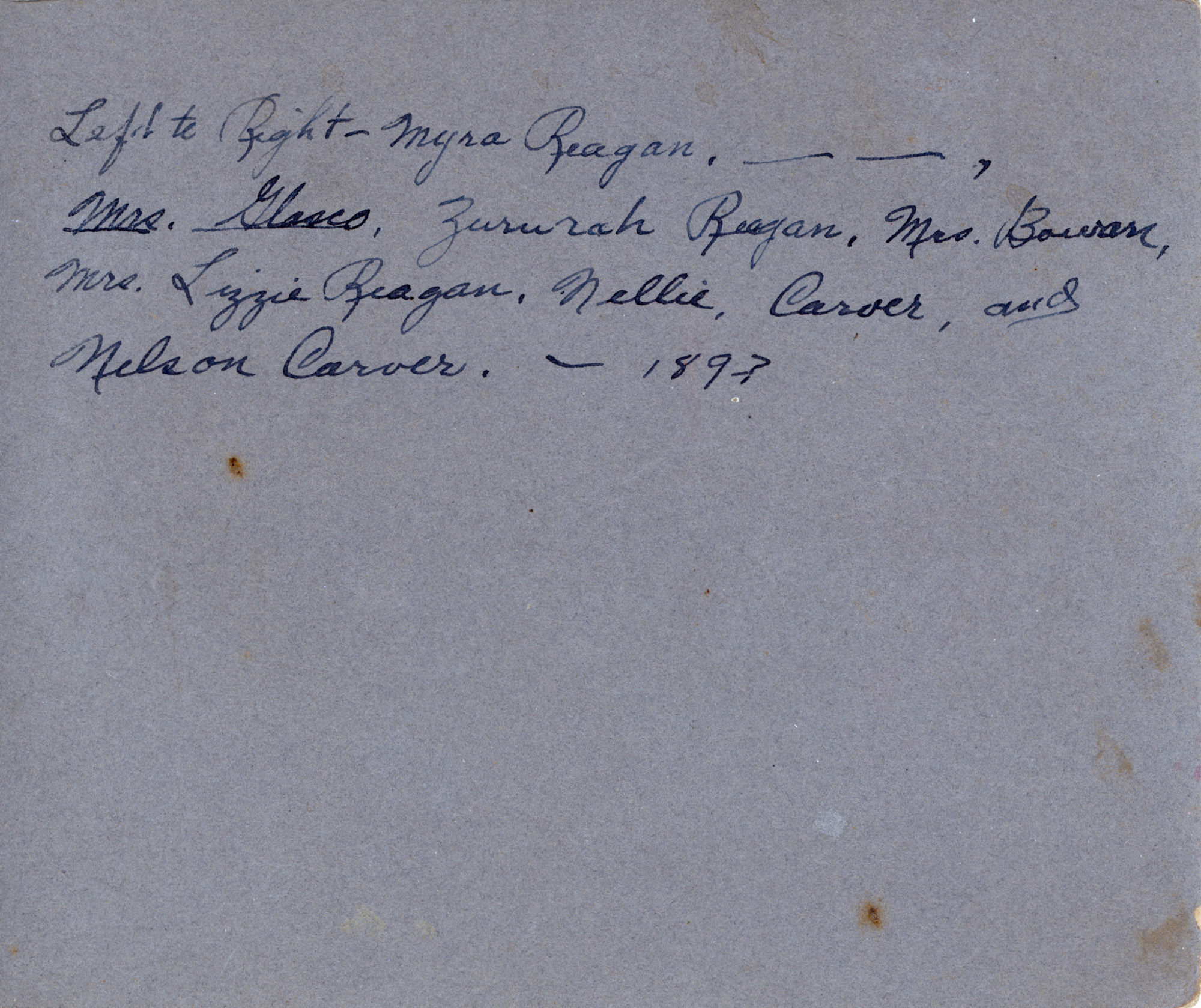 Handwritten on back "Left to Right - Myra Reagan, _ _, Mrs. Glasco, Zururah Reagan, Mrs. Bowen, Mrs. Lizzie Reagan, Nellie, Carver, and Nelson Carver. -- 189_?" - Date