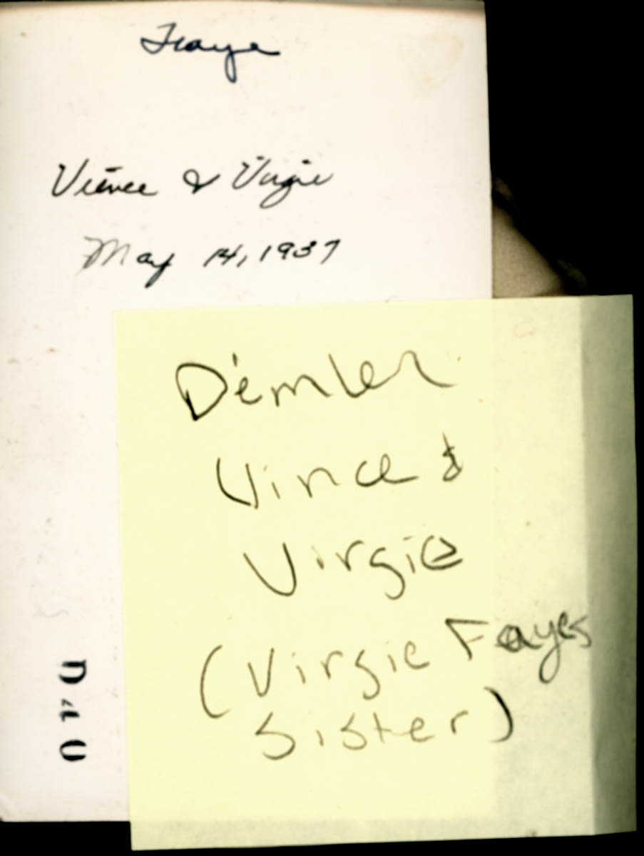 Handwritten labels on back say "Faye -- Vince & Virgie May 14, 1937" and "Dimler Vince & Virgie (Virgie Faye's sister" - Date