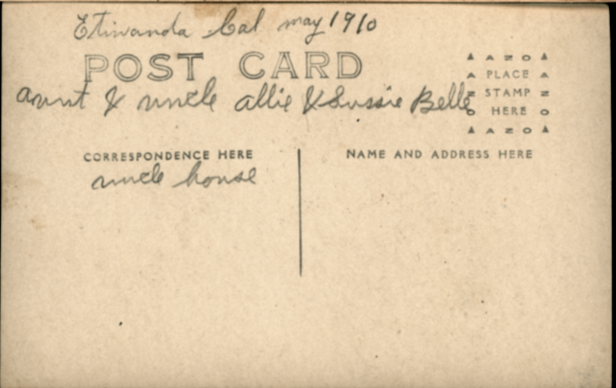 Handwritten label on back says "Etiwanda Cal May 1910 Aunt & Uncle Allie & Sussie Belle Uncle house" - Date