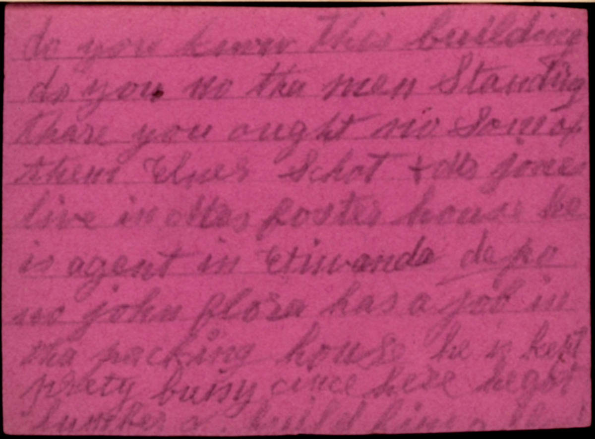 Handwritten label on back says "Do you know this building do you know no the men standing there you ought no some of them Elmer Schot & Otto Jones live in Ottos [?] house he is agent in Etiwanda depo and John flora has a job in the packaging house he is kept pretty busy cince here he got lumber [illegible]" - Creator