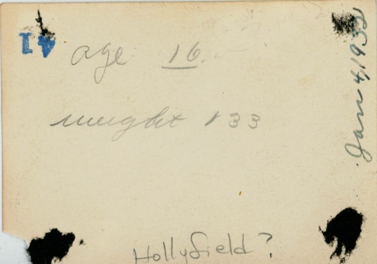 Handwritten on back “Age 16 weight 133” “Hollyfield?” and “Jan 4, 1932”