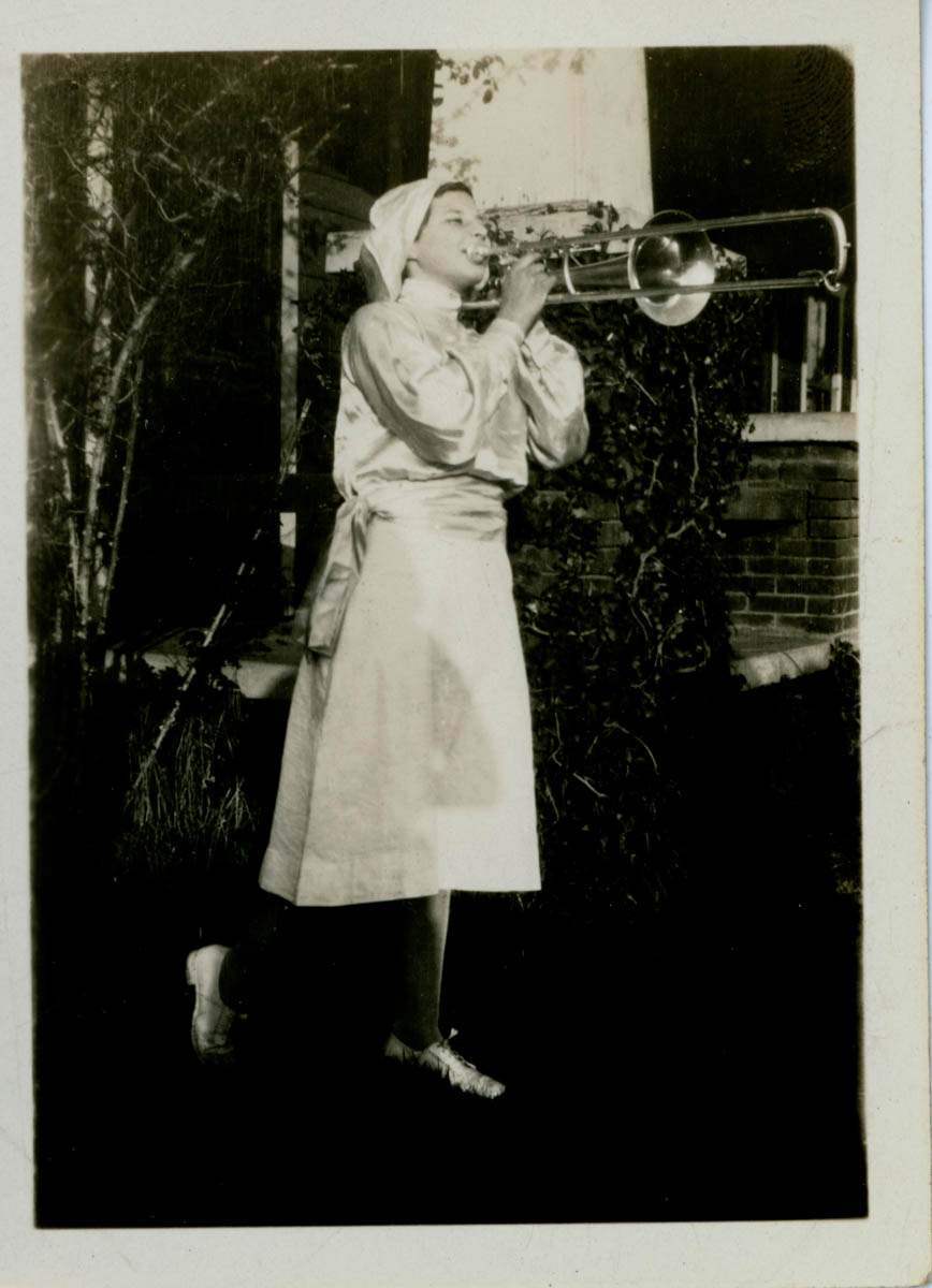 Handwritten on back “Mary Hollyfield in her band uniform she marched in New Years Parade in Pasadena. Jan 1. 52 in tall weight 118 age 14 Jan 4, 1932”