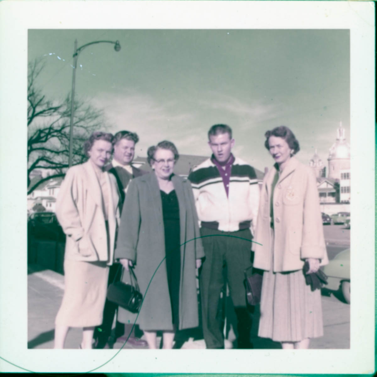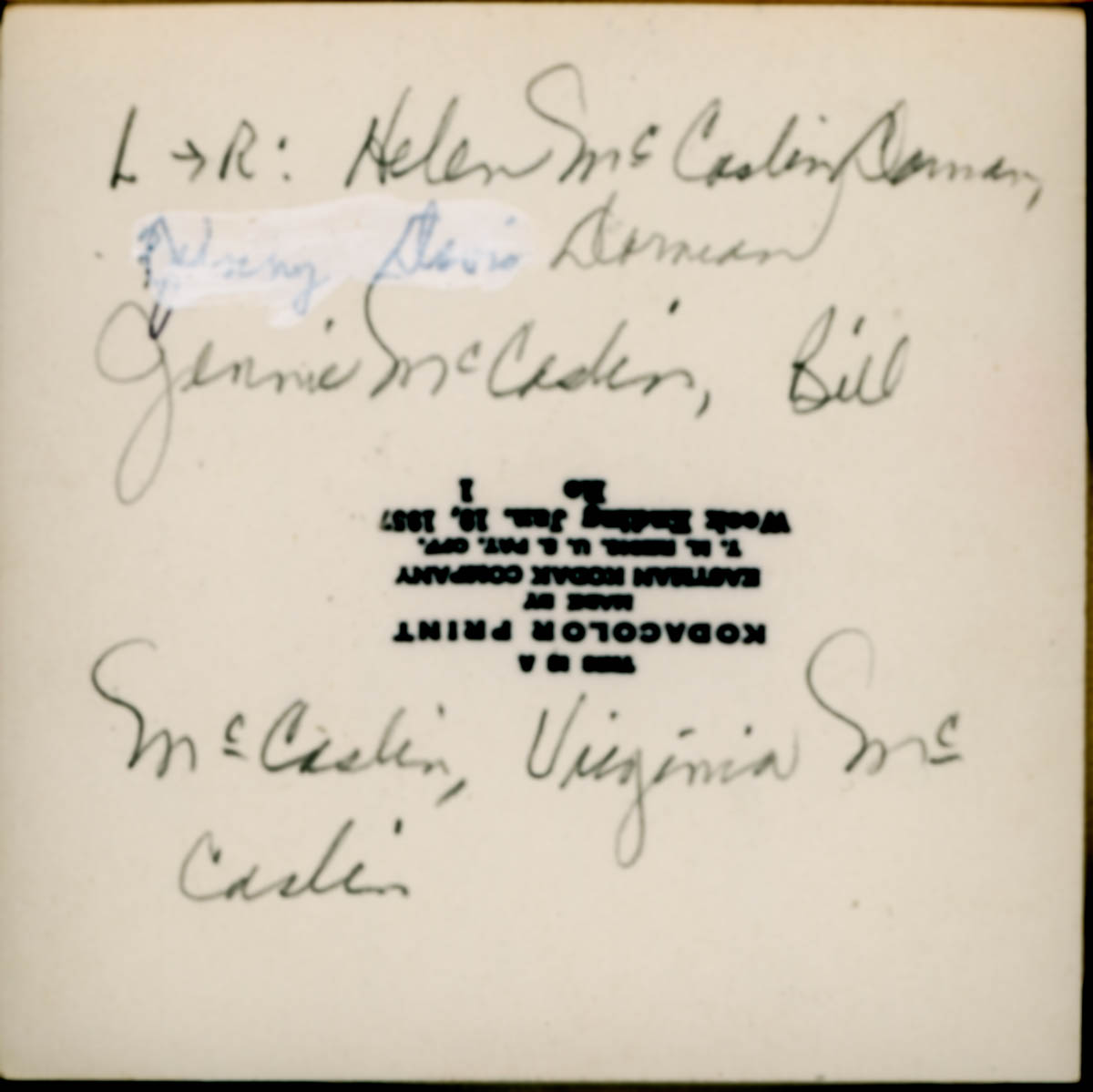 Handwritten label on back says "L - R: Helen McCaslin Dorman, Dorman, Jennie McCaslin, Bill McCaslin, Virgina McCaslin" Stamped label on back says "Week of Jun 10, 1957" - Date