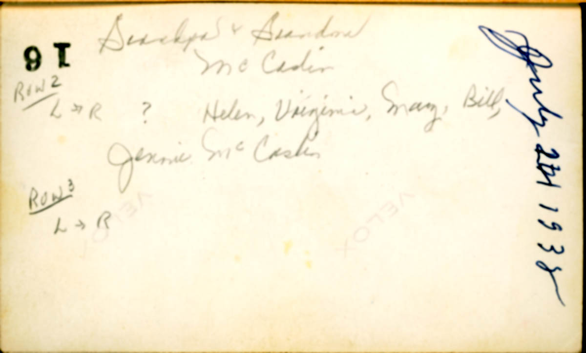 Handwritten label on back says "Grandpa & Grandma McCaslin Row 2 L-R: Helen, Virginia, Mary, Bill, Jennie McCaslin Row 3 L-R July 24 1938" - Date