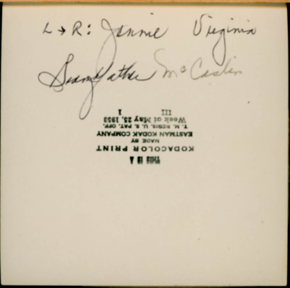 Handwritten label on back says "L - R: Jennie Grandfather McCaslin Virginia" Stamped label on back says "Week of May 25, 1953" - Date