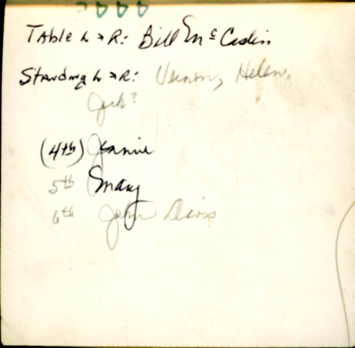 Handwritten label on back says "Table L-R: Bill McCaslin Standing L-R: Vernon, Helen, Jack? (4th) Jennie 5th Mary 6th Jack Davis" - Creator