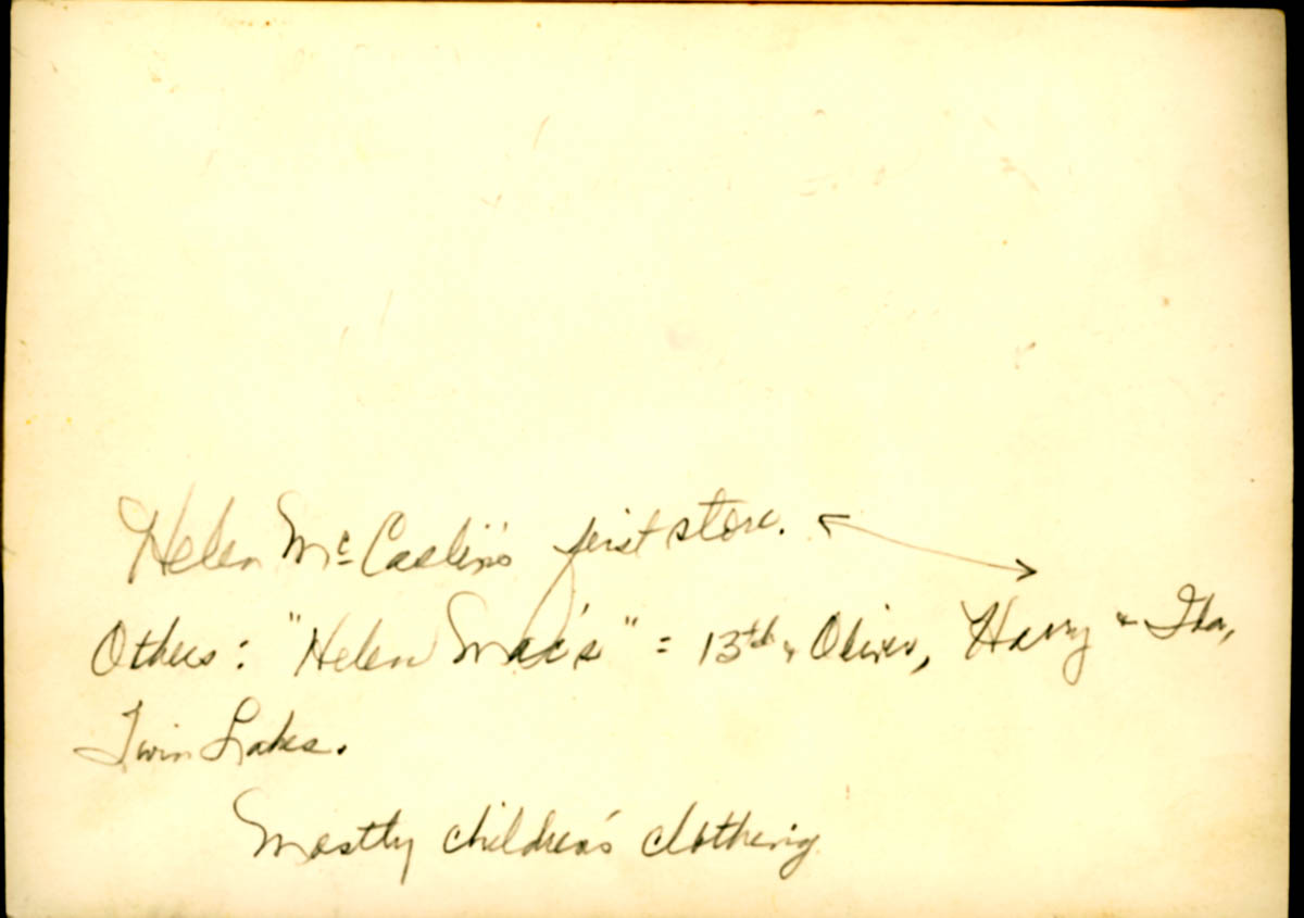 Handwritten note on back says "Helen McCaslin's first store. Others: 'Helen Mac's = 13th & Oliver, Harry & Ida, Twin Lakes. Mostly children's clothing." - Creator