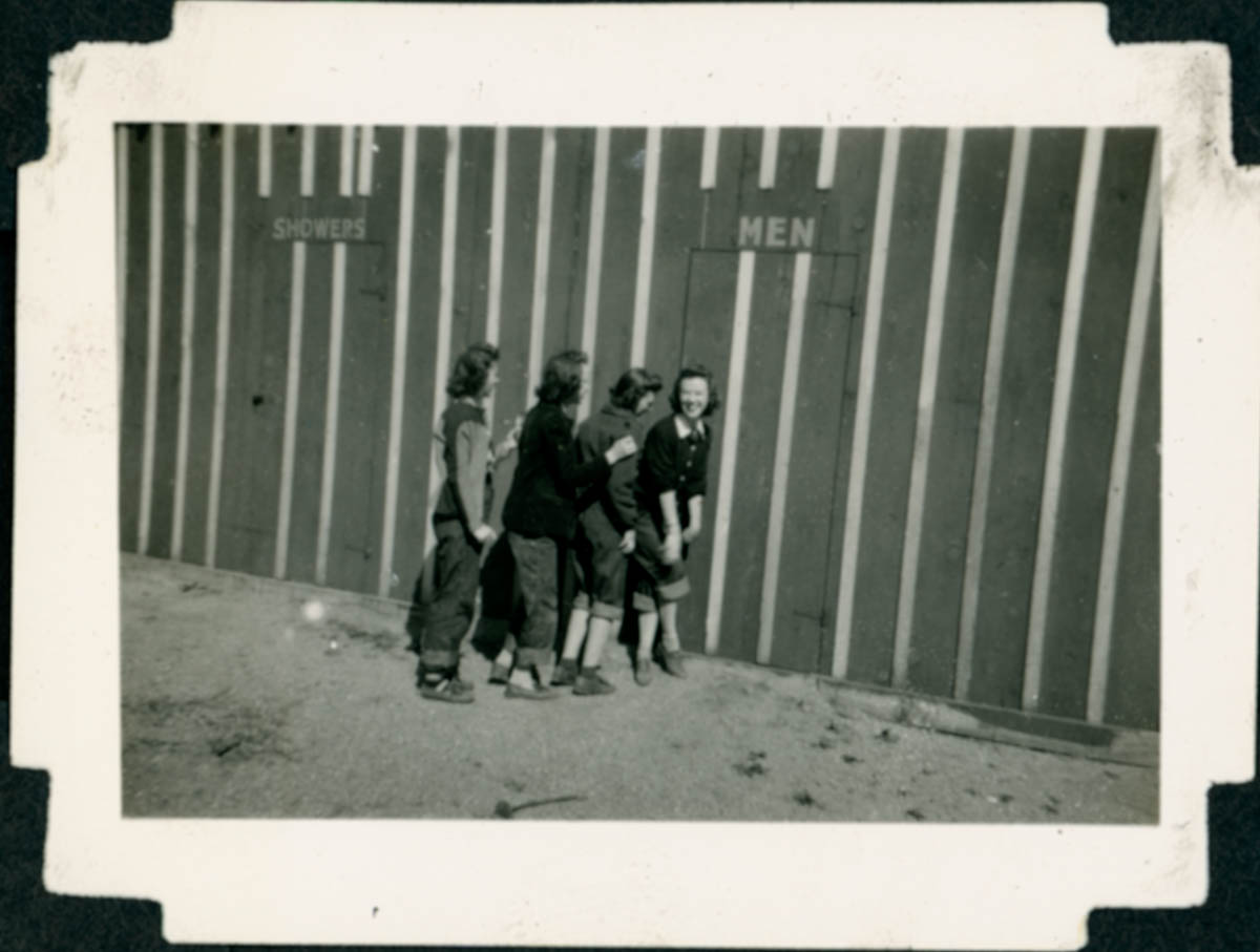 This is a photo in a photograph album. Handwritten label on page says "February 1942 Helen McCaslin Margaret Walling Jean Donley Virginia Nevius Phyllis McBride" - Date