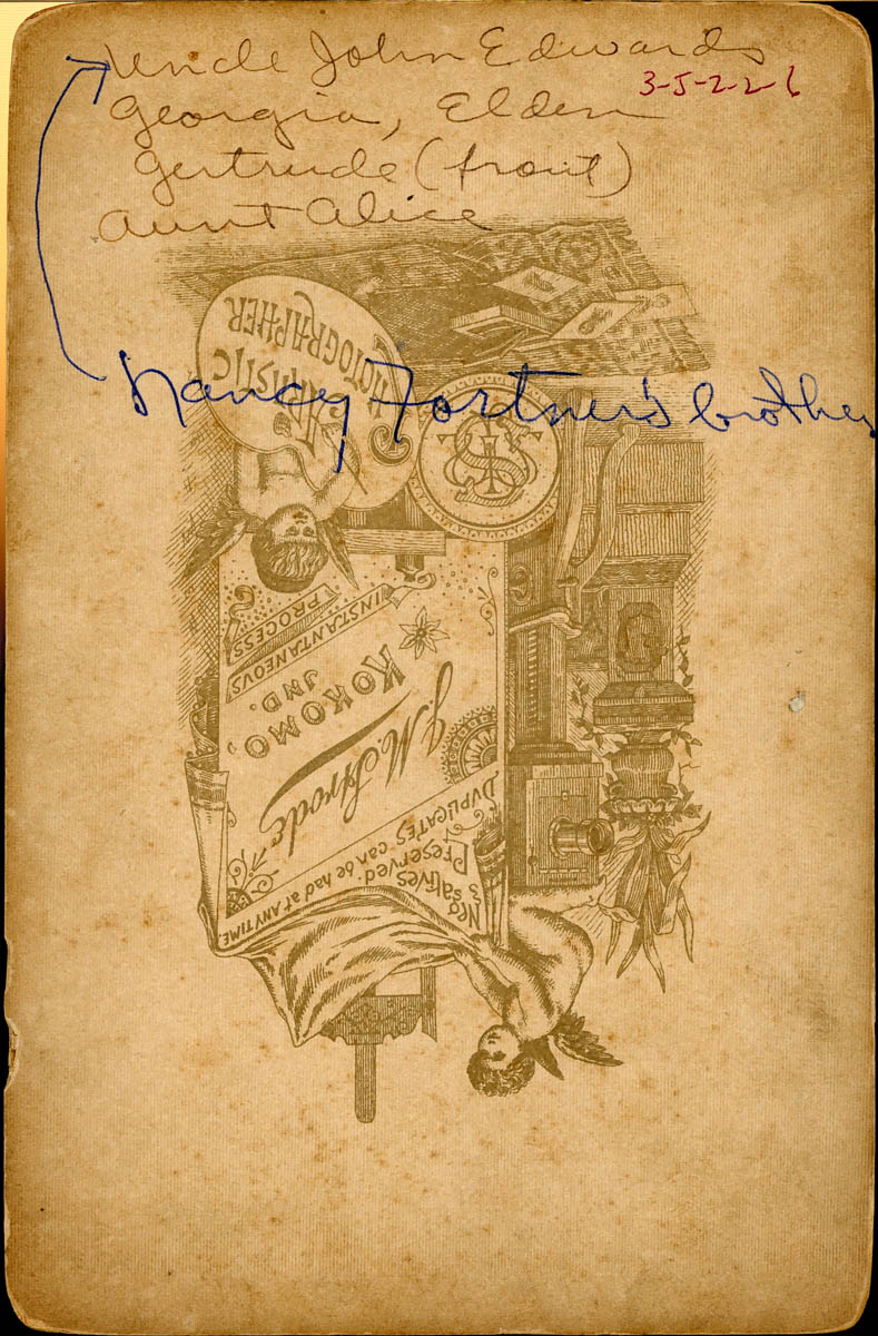 Handwritten on back “Uncle John Edwards, Georgia, Eldon, Gertrude (front), Aunt Alice” “Nancy Fortner’s brother” “3-5-2-2-1” - Creator