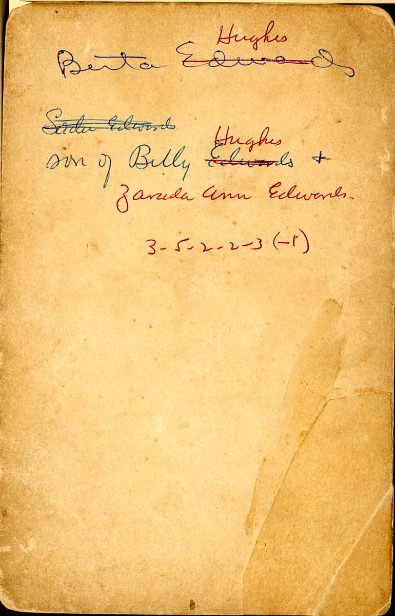 Handwritten on back “Berta Hughes, son of Billy Hughes & Zaruda Ann Edwards 3-5-2-2-3 (-1)” - Creator