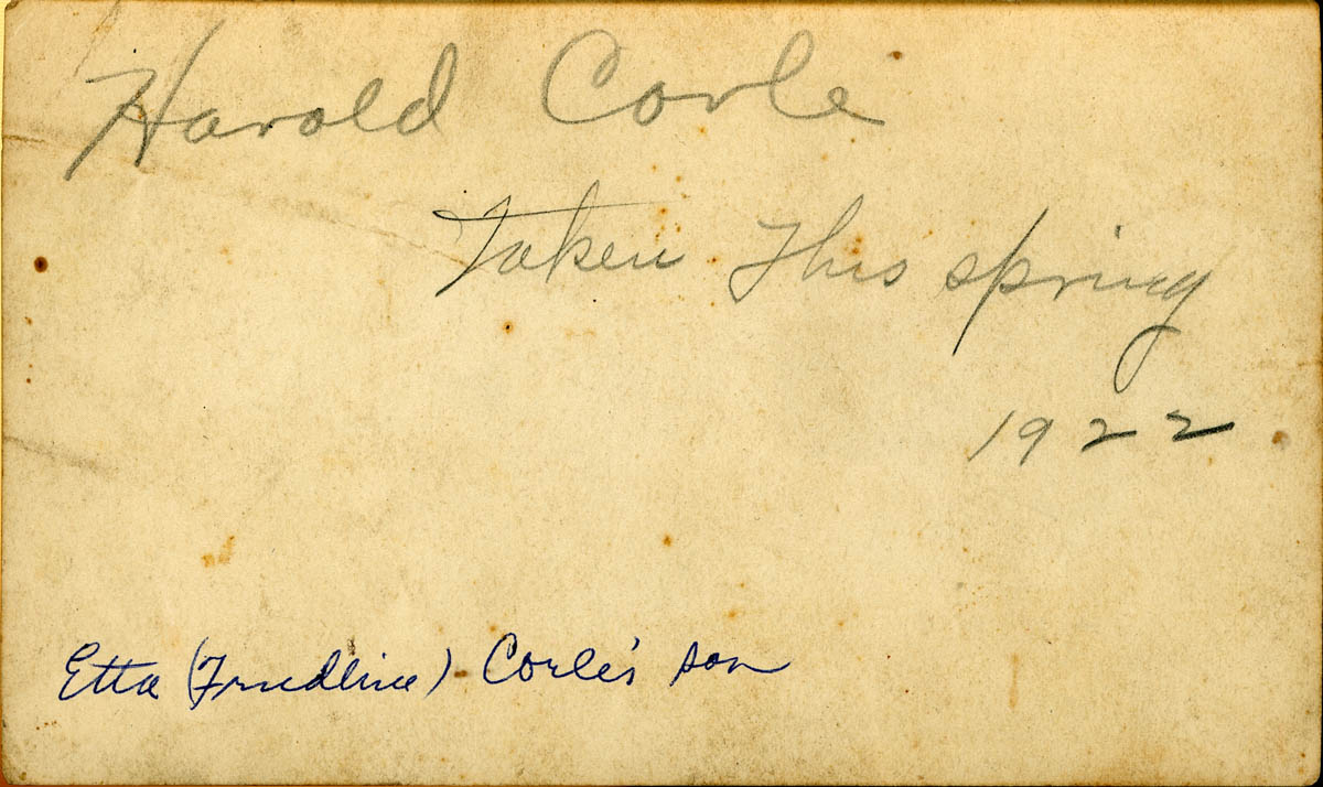 Handwritten labels on back “Harold Corle taken this spring 1922” “Etta (Freidline) Corle’s son” - Date