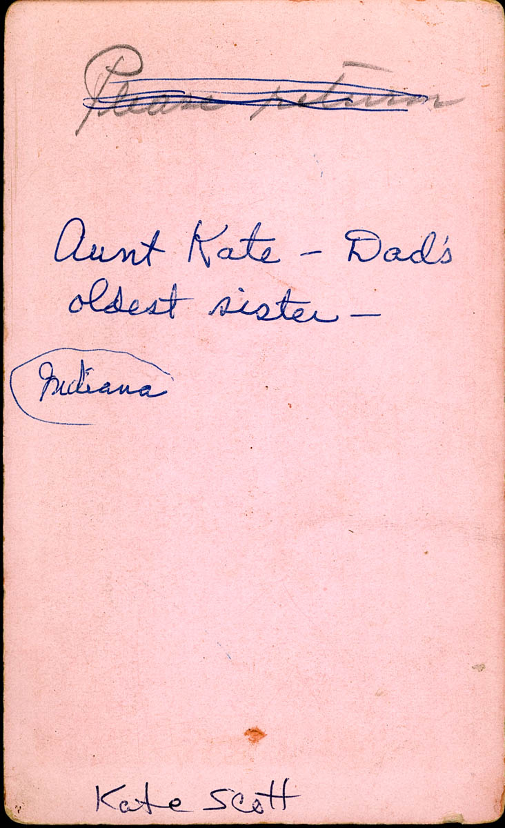Handwritten label on back says “Aunt Kate – Dad’s oldest sister – Indiana. Kate Scott” - Creator
