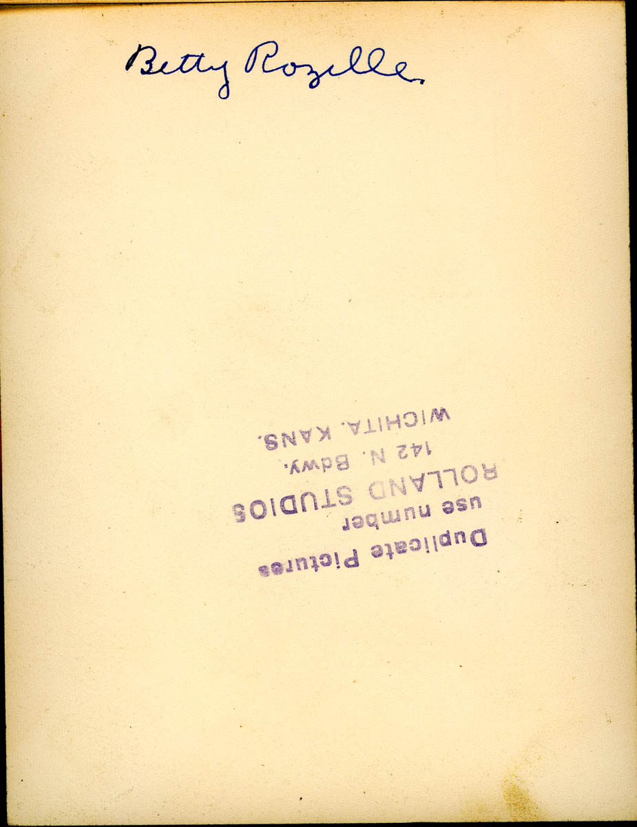 Handwritten label on back says “Betty Rozelle.” Stamp on back says “Duplicate picture use number Rolland Studios 142 N. Bdwy. Wichita, Kans” - Creator
