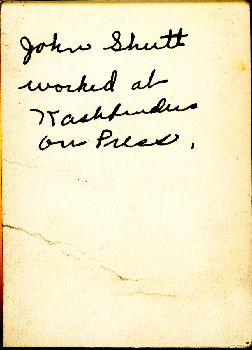 Handwritten label on back says “John Shutt. Worked at Kashfinders on press.” - Creator