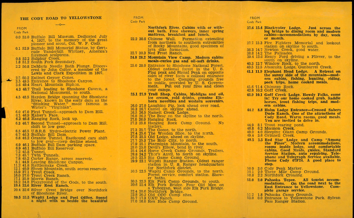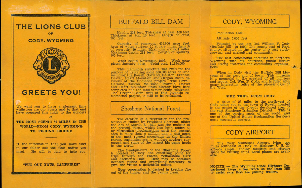 Lions Club of Cody, Wyoming, “Lions Club Guide to the Scenic Highway Between Cody, Wyoming, and Yellowstone National Park,” MHGS Digital Collections, accessed April 30, 2026, https://mhgswichita.org/om/items/show/7807.