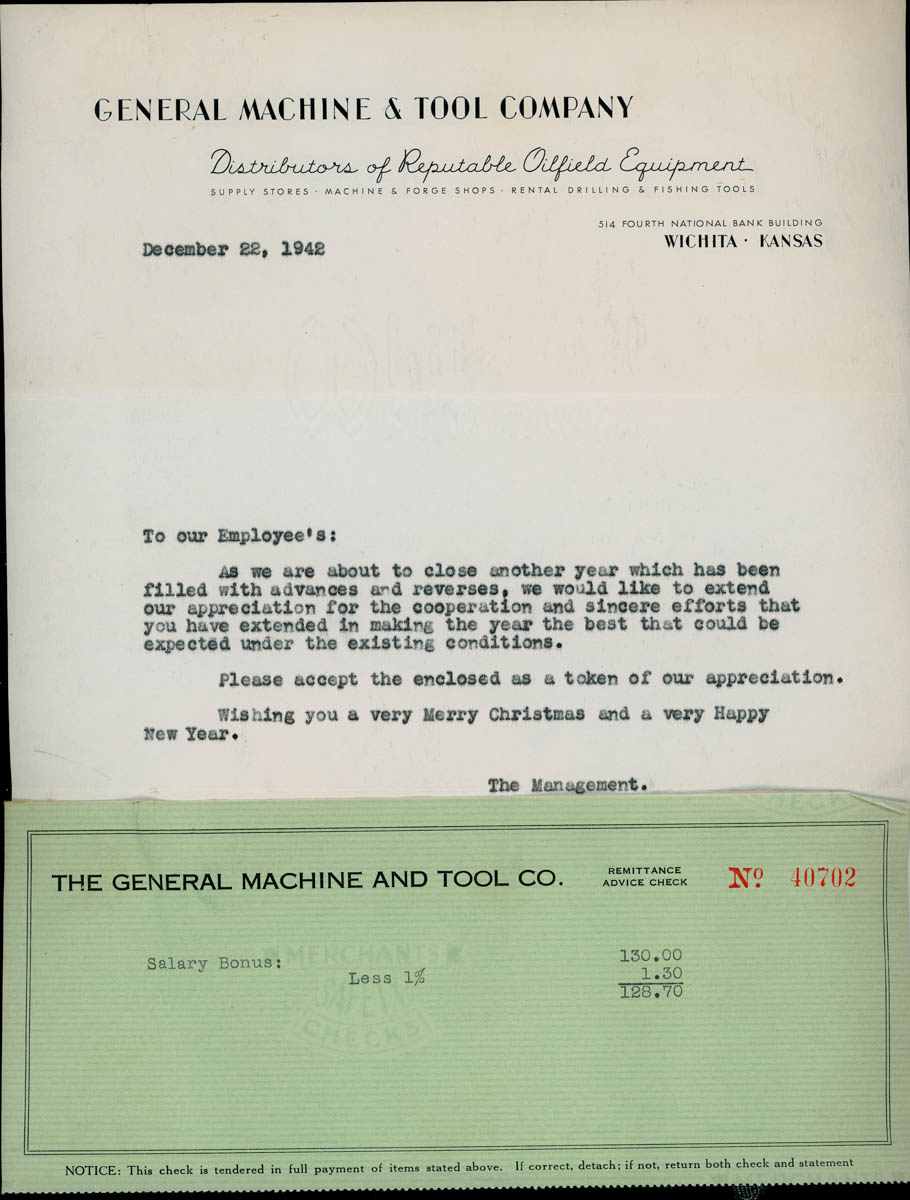 General Machine & Tool Company, “Christmas Bonus Letter for Employees of General Machine & Tool Company,” MHGS Digital Collections, accessed April 16, 2026, https://mhgswichita.org/om/items/show/7820.