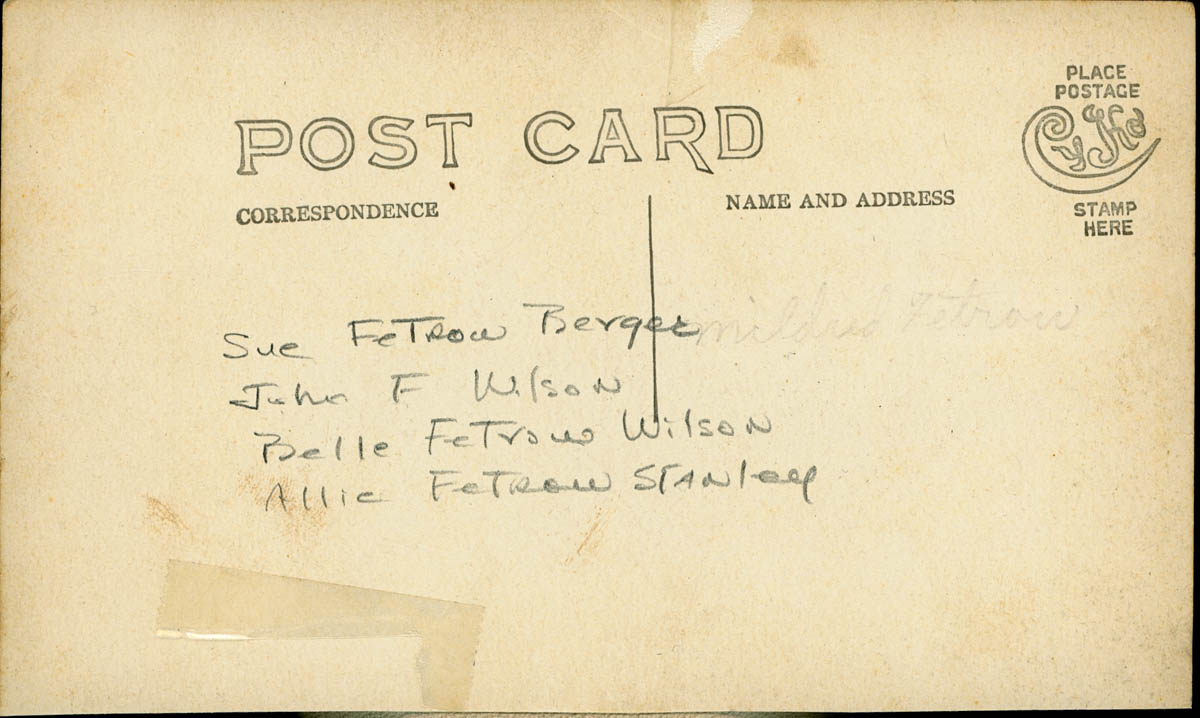 - Real photo postcard of four people sitting on a beach. Handwritten note on back says "Sue Fetrow Berger, John F Wilson, Belle Fetrow Wilson, Allie Fetrow Stanley" This is an item in a scrapbook.
